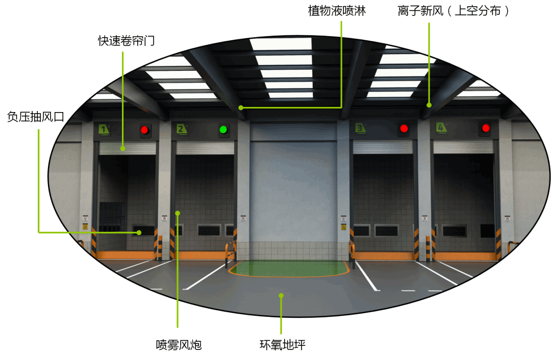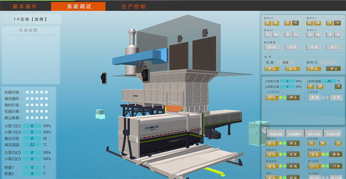 在智能操作方面,大型生活垃圾转运站所有设备均可通过中央控制系统远程操作,站内作业车辆通过交通指挥系统全自动点对点指挥,垃圾压缩循环,快速卷帘门、负压抽风系统、离子新风系统及植物液喷雾除臭系统可按设定程序自动运行,无需人工干预。此外,三维动态仿真中控界面结合站内监视系统,可实现作业过程的适时动态显示及监控。站内配置的自动清渣及自动冲洗系统,使站内清理保洁自动化,解放人工劳动力。