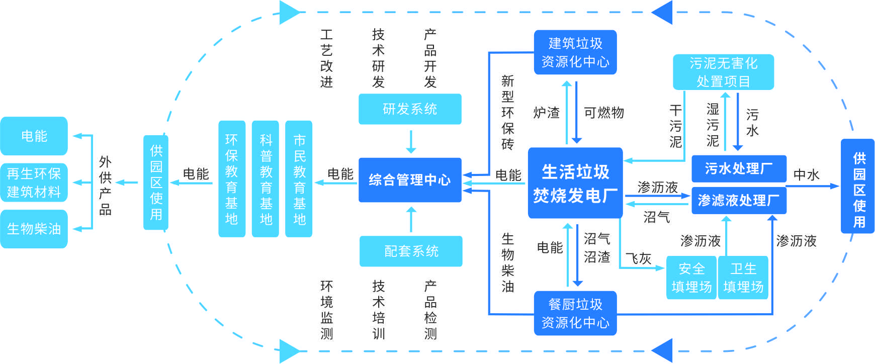 星空游戏环境循环经济产业园模式以生活垃圾焚烧发电厂为园区核心,统筹各类生活垃圾处置中心的配套建设,对各类生活废弃物进行无害化、减量化、资源化处理,输出电能、建筑材料、生物柴油等副产物,为园区生产、生活提供服务。